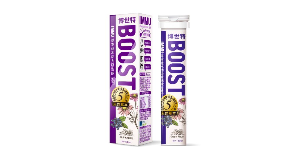 碳酸氫鈉、檸檬酸、酒石酸、D-山梨醇、抗壞血酸(維生素C)、聚乙二醇、檸檬酸鈉、葡萄香料粉、葡萄粉末香料、紅甜菜粉、紫錐菊汁濃縮粉、接骨木莓萃取物、黃耆萃取物、金銀花萃取物、醋磺內酯鉀(甜味劑) 、聚乙烯吡咯烷酮、蔗糖素(甜味劑)、維生素E50% 【乙酸dl-a -生育 醇酯(維生素E)、乾燥葡萄糖漿、辛烯基丁二酸鈉澱粉、二氧化矽)、人參萃取物、硫酸鋅、硒酵母、維生素A棕櫚酸酯粉【辛烯基丁二酸鈉澱粉、麥 芽糊精、維生素A棕櫚酸酯油、糖、乙酸dl-x-生育醇酯(維生素E)(抗氧化劑)、二丁基羥基甲苯(抗氧化劑)]、核黃素(維生素B2)